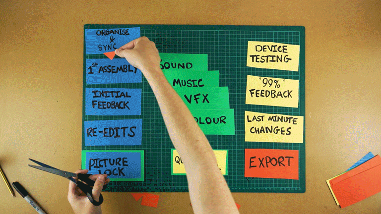 We’ll be covering organise and sync, first picture assembly, initial feedback, re-edits & picture lock, sound, music, VFX, colour, quality control, device testing, a 99% feedback stage, last minute changes, and EXPORT.